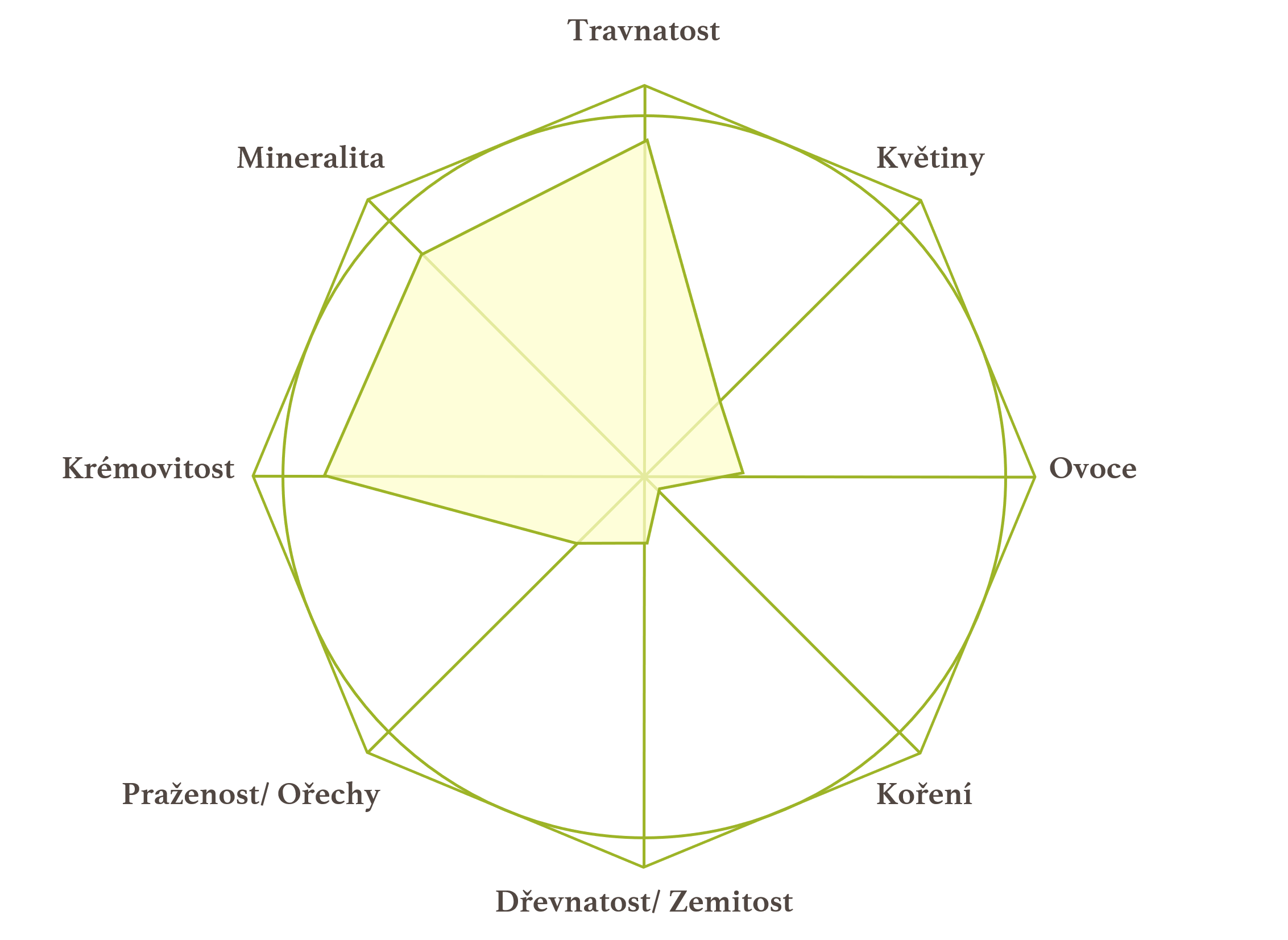 Umami, jemná travnatost, mořský vzduch, hráškové lusky, smažená cuketa ve smetanové omáčce, svěžest, jemná svíravost po stranách jazyka.