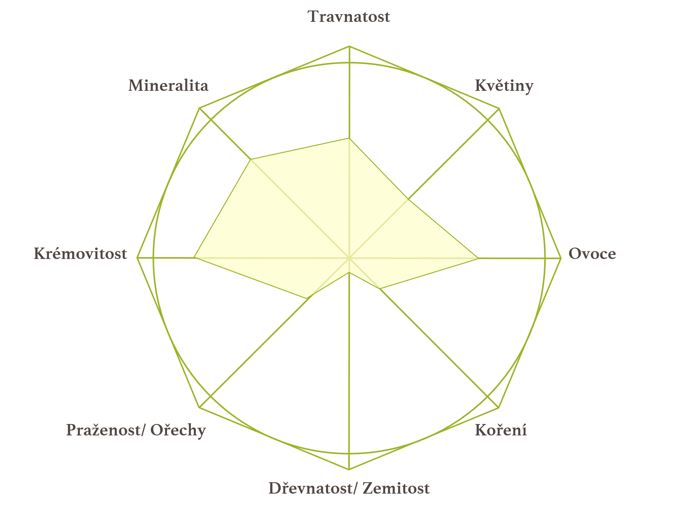 Hladká textura, edamame, sůl, čerstvý chléb, umami,  v dochuti jemná svíravost, borůvky a máslo.